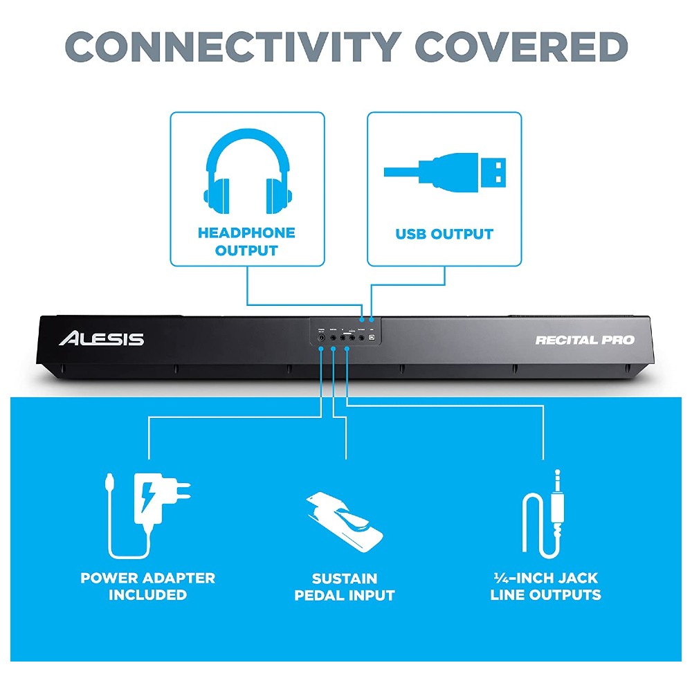 The Alesis Recital Pro is a full-featured digital piano with 88 full-sized hammer-action keys and adjustable touch response. With 12 premium built-in realistic voices including Acoustic Piano, Vibraphone, Organ, Strings, Acoustic Bass and more, whatever your next performance demand, Recital Pro has you covered! 20-watt built-in speakers and a 128-note max note polyphony ensure Recital Pro delivers ultra-realistic sound and authentic playing experience, every time!