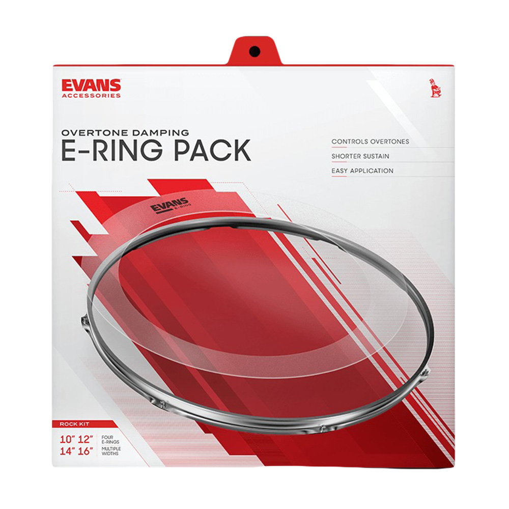 The Evans E-Ring Packs contains easy-to-use external overtone control rings that float on the surface of a drumhead to remove overtones and flattens the drumhead's sound, allowing for easier tuning.