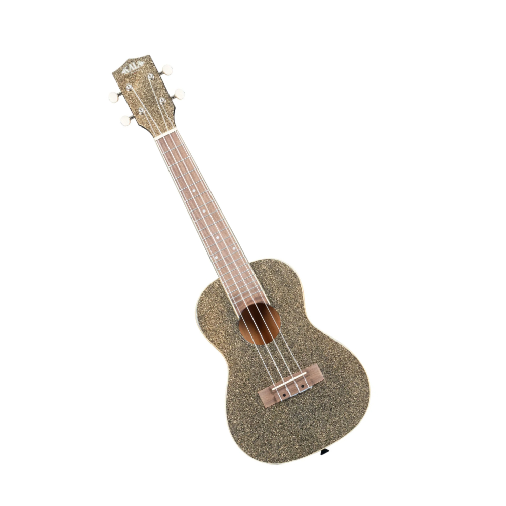 The Kala Stardust Gold Sparkle concert uke, makes you want to stop and stare and see if they sound as good as they look. Featuring a Basswood body, matched with Mahogany back and sides, they combine to produce a bright tone. The Mahogany neck and walnut fingerboard are smooth and comfortable to play, the Graph Tech NuBone nut and saddle, Aquila strings and vintage machine heads enhance the overall playability. So if your looking for a uke that's affordable, sounds good and will make you stand out from the rest, this is the axe for you.