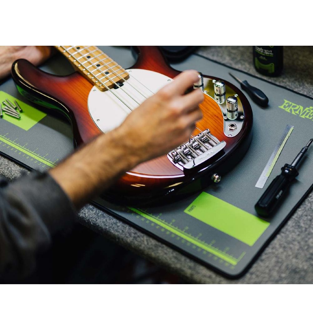 Set up, repair, and polish your instrument with the all-new Ernie Ball Techmat. Made from a durable non-slip rubber base with cushiony padding, the techmat's slip-resistant smooth fabric surface protects your instrument from dust, debris, sharp corners, and hard surfaces. The extra-large format accommodates most guitars and basses and features a metric and Imperial ruler for a quick reference guide.