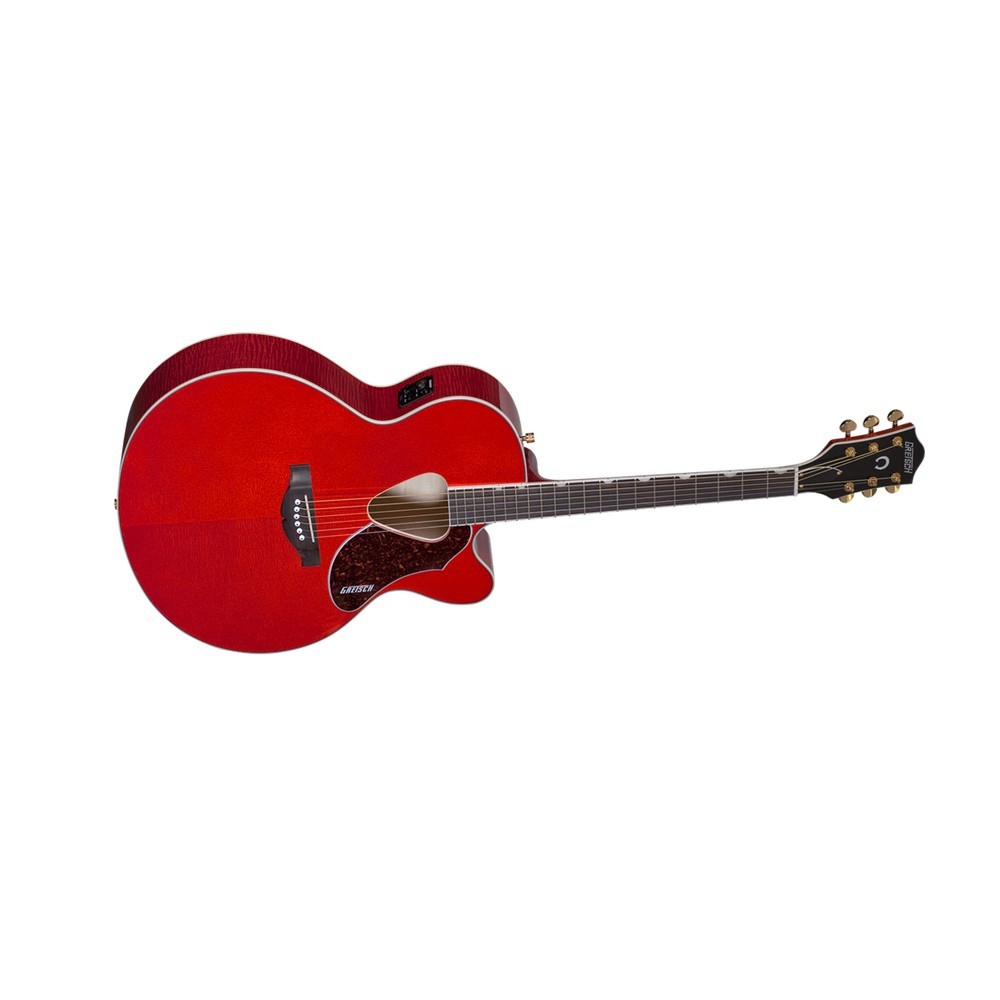 The G5022CE Rancher Jumbo Cutaway brings you the the richly resonant sound Rancher guitars are known for, thanks to the solid spruce top reinforced with scalloped X bracing. You'll find the Jumbo Cutaway body has a powerfully rich voice, allowing it to hold its own whether played acoustically or amplified. And with flame maple laminate back and sides, a mahogany neck, and a 21-fret rosewood fretboard, the Rancher Jumbo Cutaway looks as good as it sounds. You'll even be ready for exceptional plugged-in performance thanks to the built-in Fishman Isys+ preamplifier rig and Sonicore undersaddle pickup. So take a musical trip back in time, with the Gretsch G5022CE Rancher Jumbo Cutaway acoustic-electric guitar.