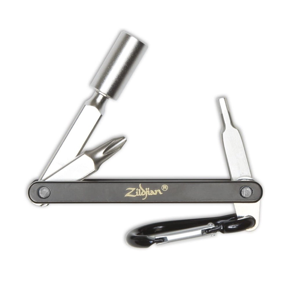 Multi-tool drum key features drum key bit attached to a 4mm hex wrench, a 3mm hex wrench, and a Phillips head screwdriver. The drum key bit is removable to use the 4mm hex wrench. The assembly and tools are made steel for durability and the frame has a black finish with gold Zildjian logo.